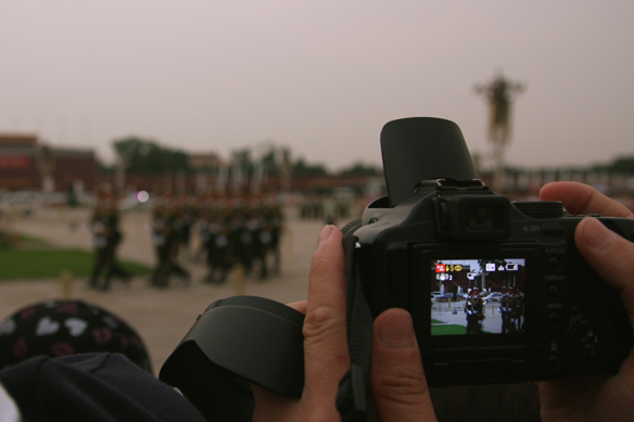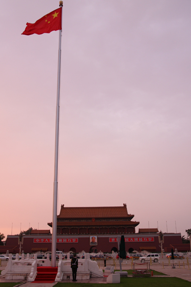 This is the beginning of the flag lowering ceremony at Tiananmen Square. There are two flag ceremonies held each day, one in the morning for the flag raising ceremony and another late in the evening for the flag lowering ceremony. In both instances, they block off Chang-An Jie (Chang-An Road) to allow troops to converge onto Tiananmen Square to perform their procession. Looking back, I should have made it to the morning session. I have heard that it's quite inspiring to stand there, bleary-eyed watching the flag rise over the thin crest of sunrise. But for those of us who can't wake up at 4:45 AM, these evening ceremonies certainly capture the ethos of that event.