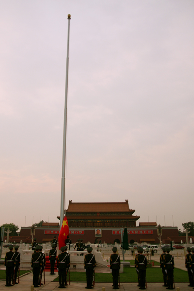 This is the tail end of the ceremony where they begin to unhinge the flag from the pole. These members of the guard eventually march back to the Forbidden City where they put away the flag until the next morning.