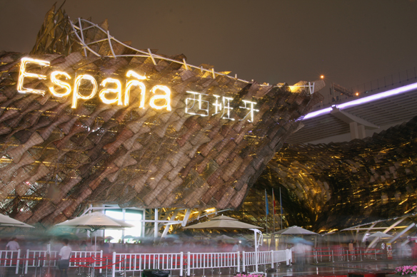 España! This was a really popular pavilion and, regardless of the time, there was always a line. You could also see from the design that the Spanish put a great deal of care into creating their pavilion. The shell of the Spanish pavilion makes ingenious use of wicker panels (a material of wood straws woven together) to create this wall with an almost-fluid appearance. Also, because it's flammable, there were signs everywhere asking people not to smoke!